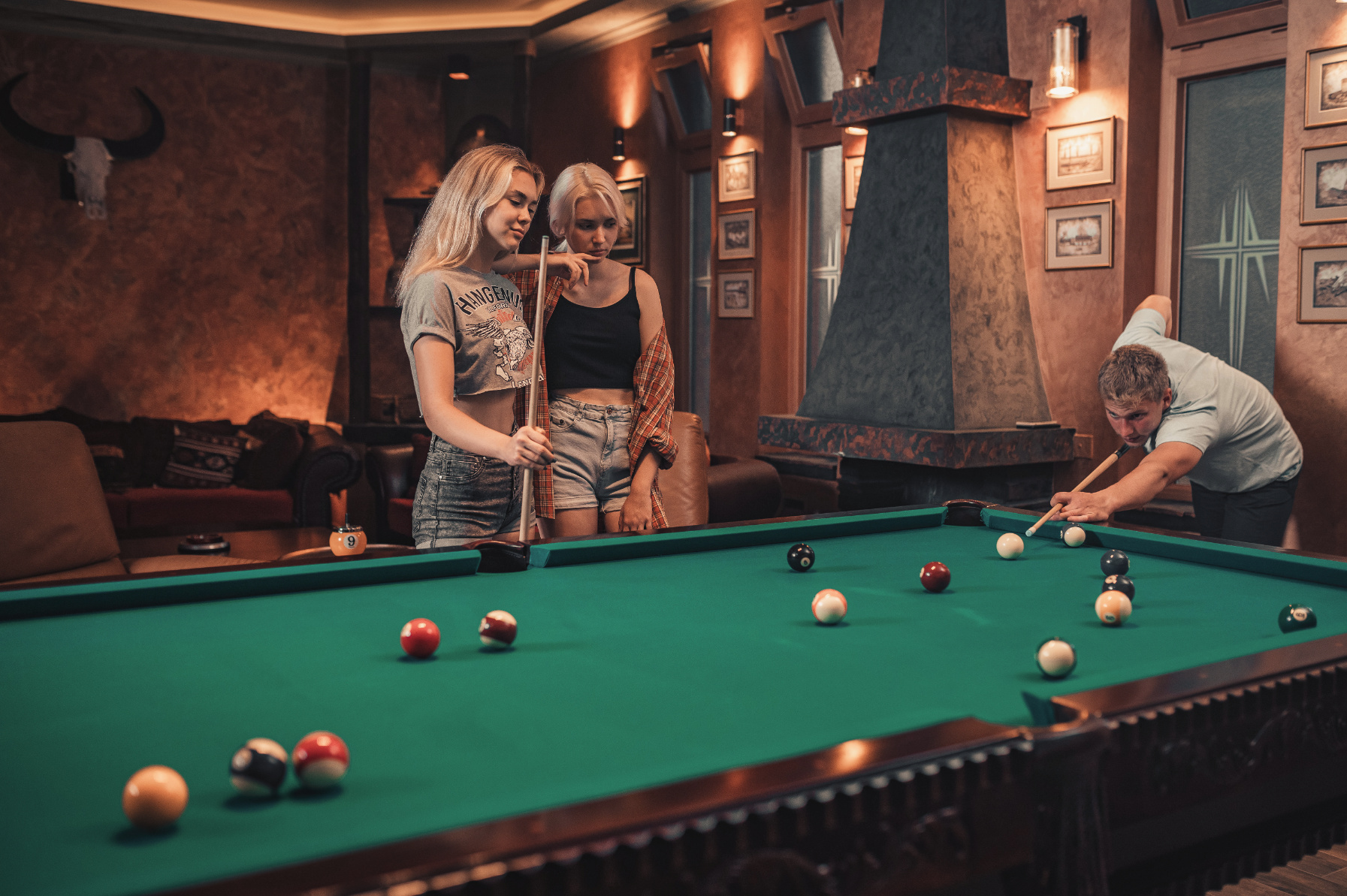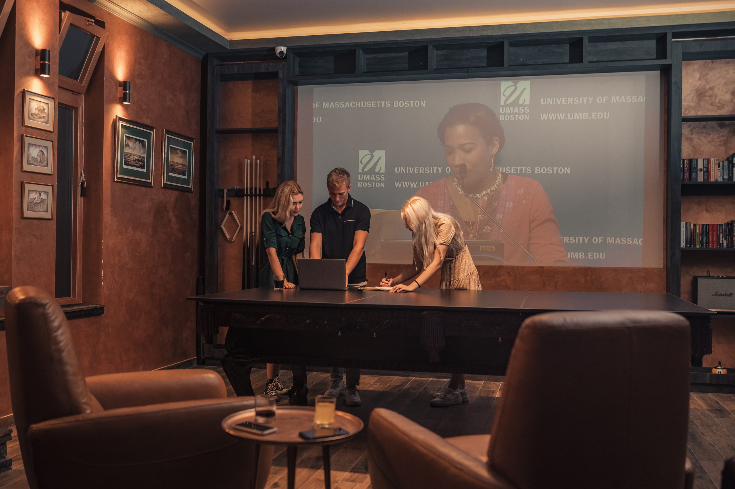 Billiard table turns into a massive conference table for ten or a buffet for your party or friend gathering. VIP lounge hosts up to 25 people.