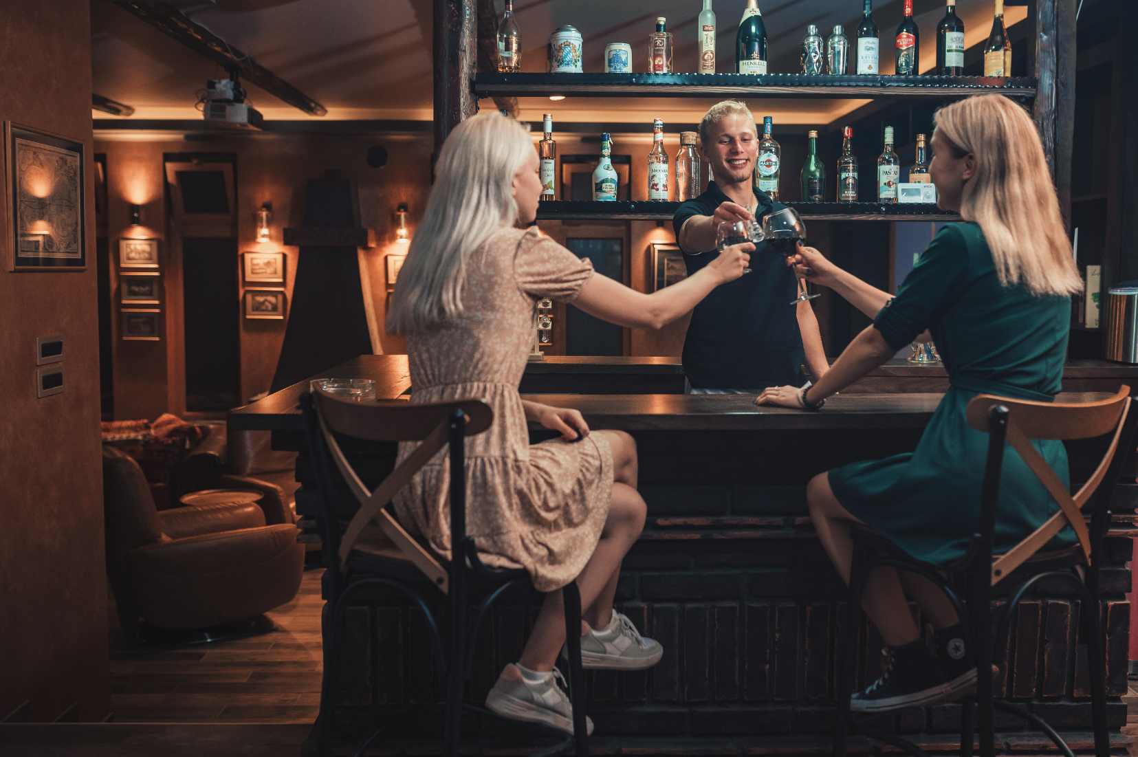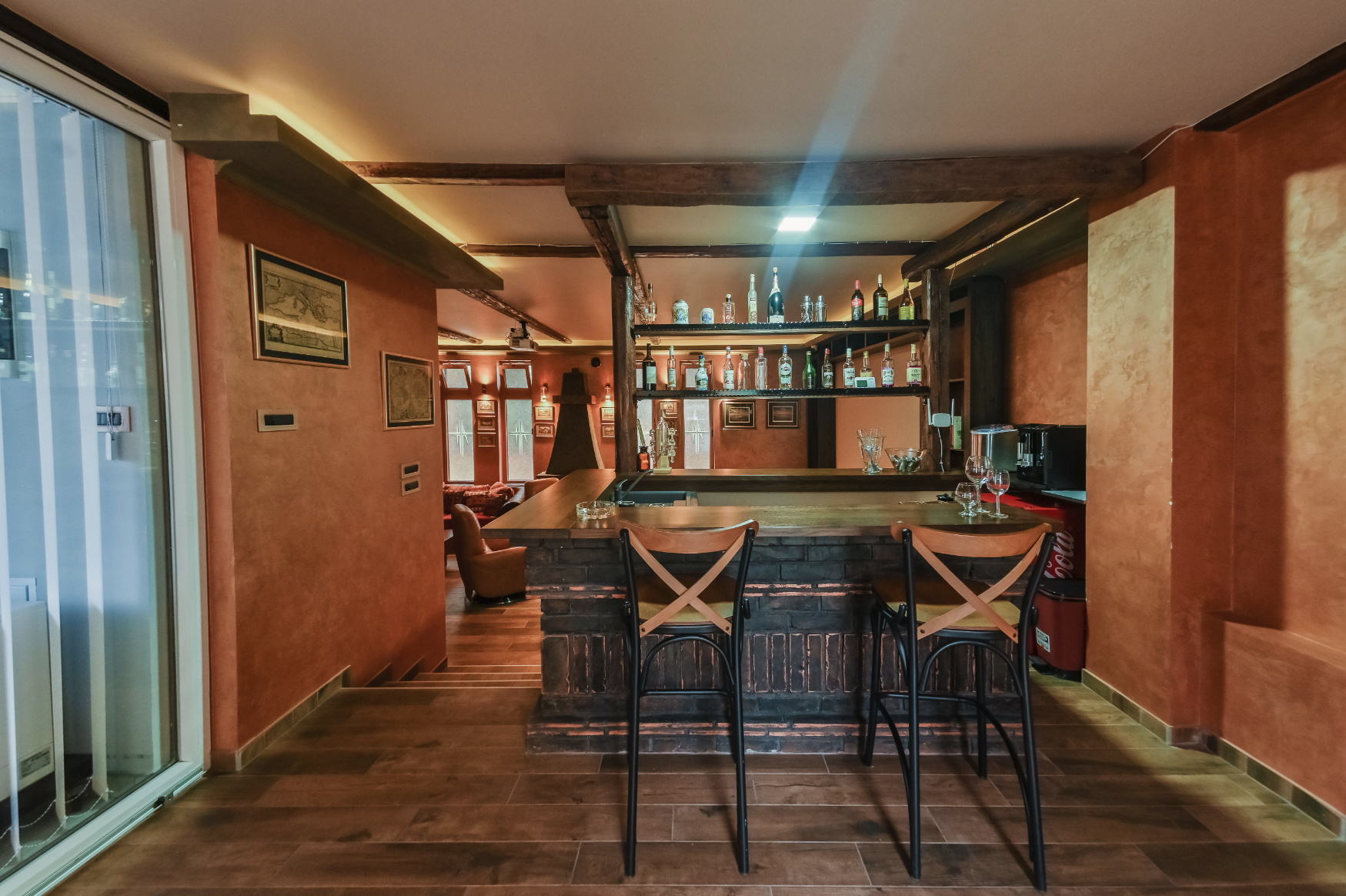VIP lounge is a two-level areawith rusticwooden beams and a brick-laid bar on the top level, and an entertainment area featured by a 9“billiard table and widescreen cinema in the lower level.