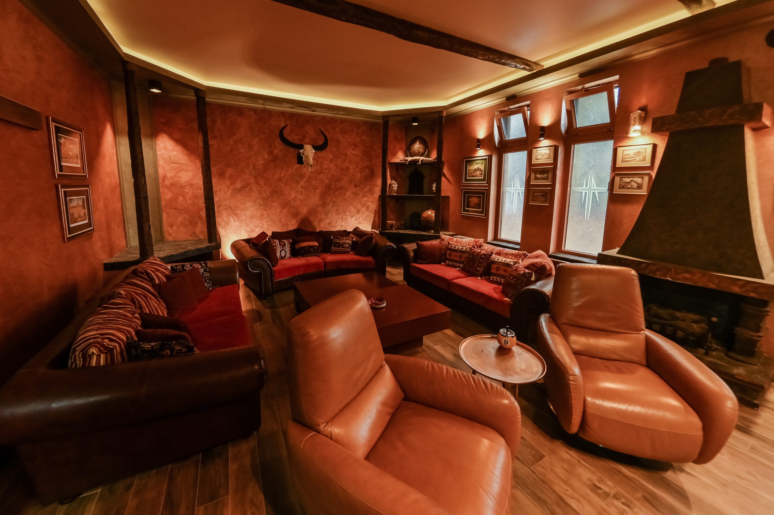 VIP Lounge is a multifunctional socializing area with oversized sofas andreclining cinema chairs. Picture yourself having a drink beside the open fireplace, playing a game of billiard&snooker, or simply enjoy watching a movie or a sports event cast from a ceiling mounted widescreen 4K projector.