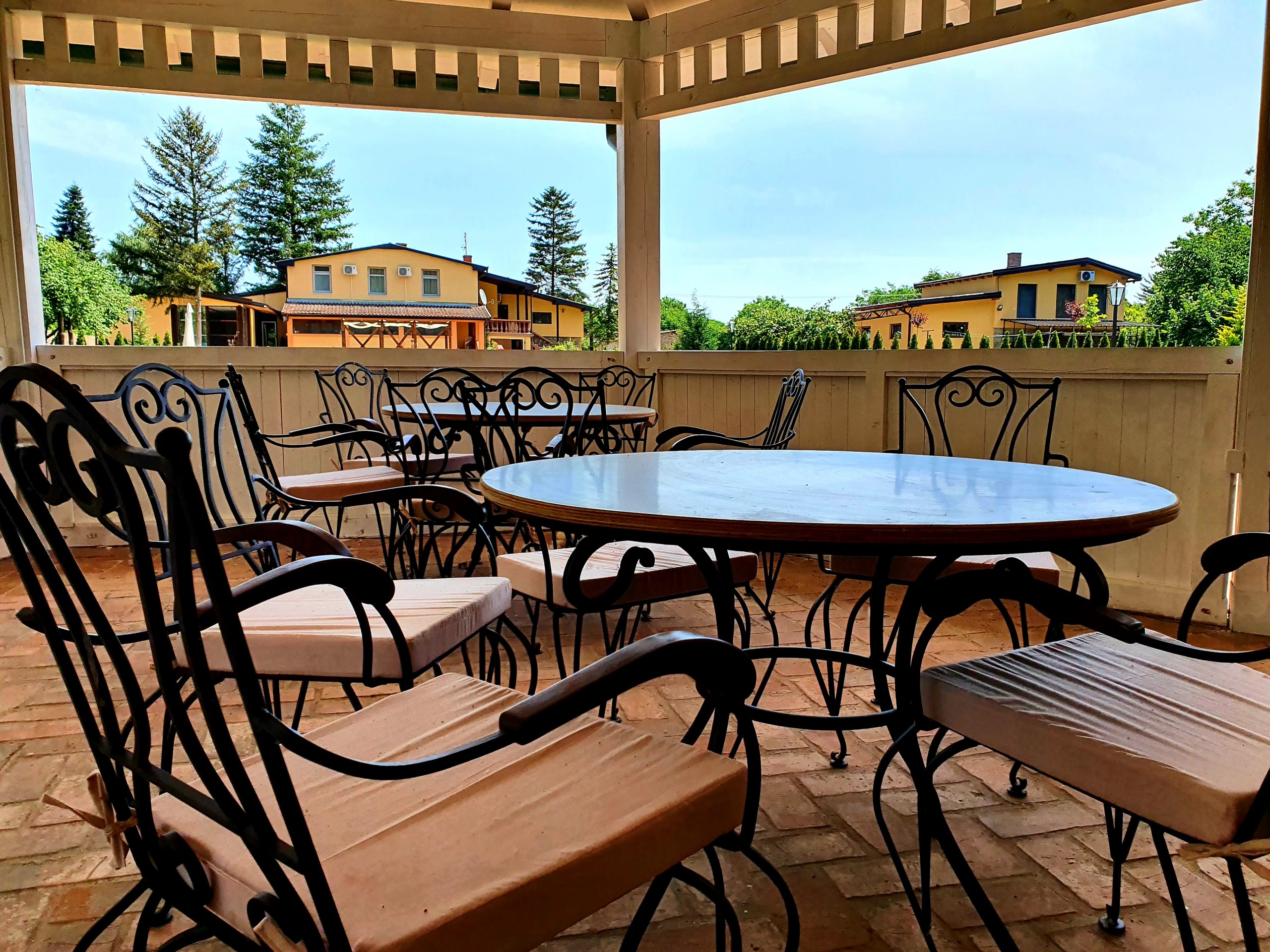 Opremljen je okruglim stolovima i stolicama od kovanog gvoždja i sa 3 strane komunicira sa okruženjem: Alejom lešnika, drvenom kućicom na starom orahu i dečijim igralištem.